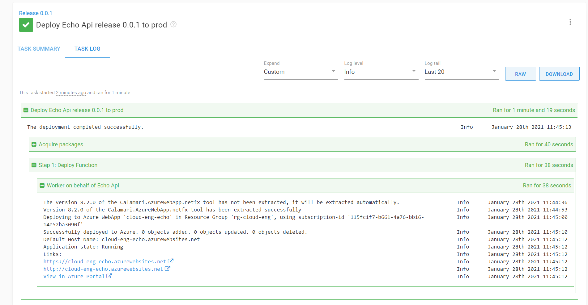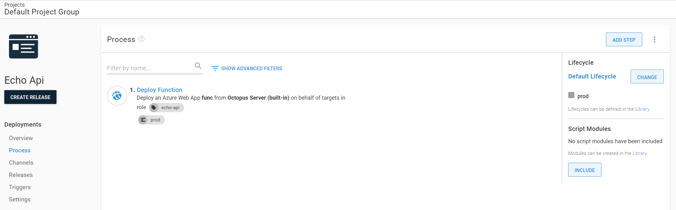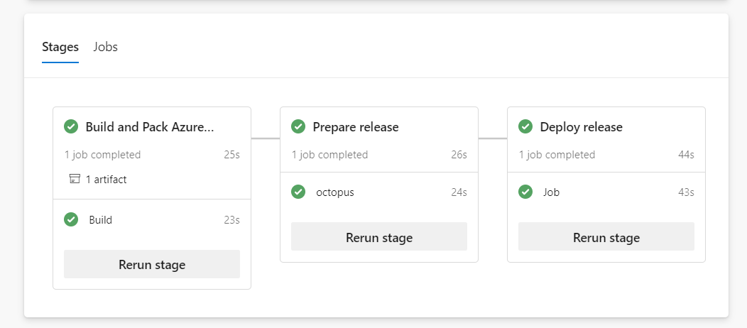 My deployment is not complicated actually, just one step that is picking up the package from a built-in feed and pushing it to my only environment.